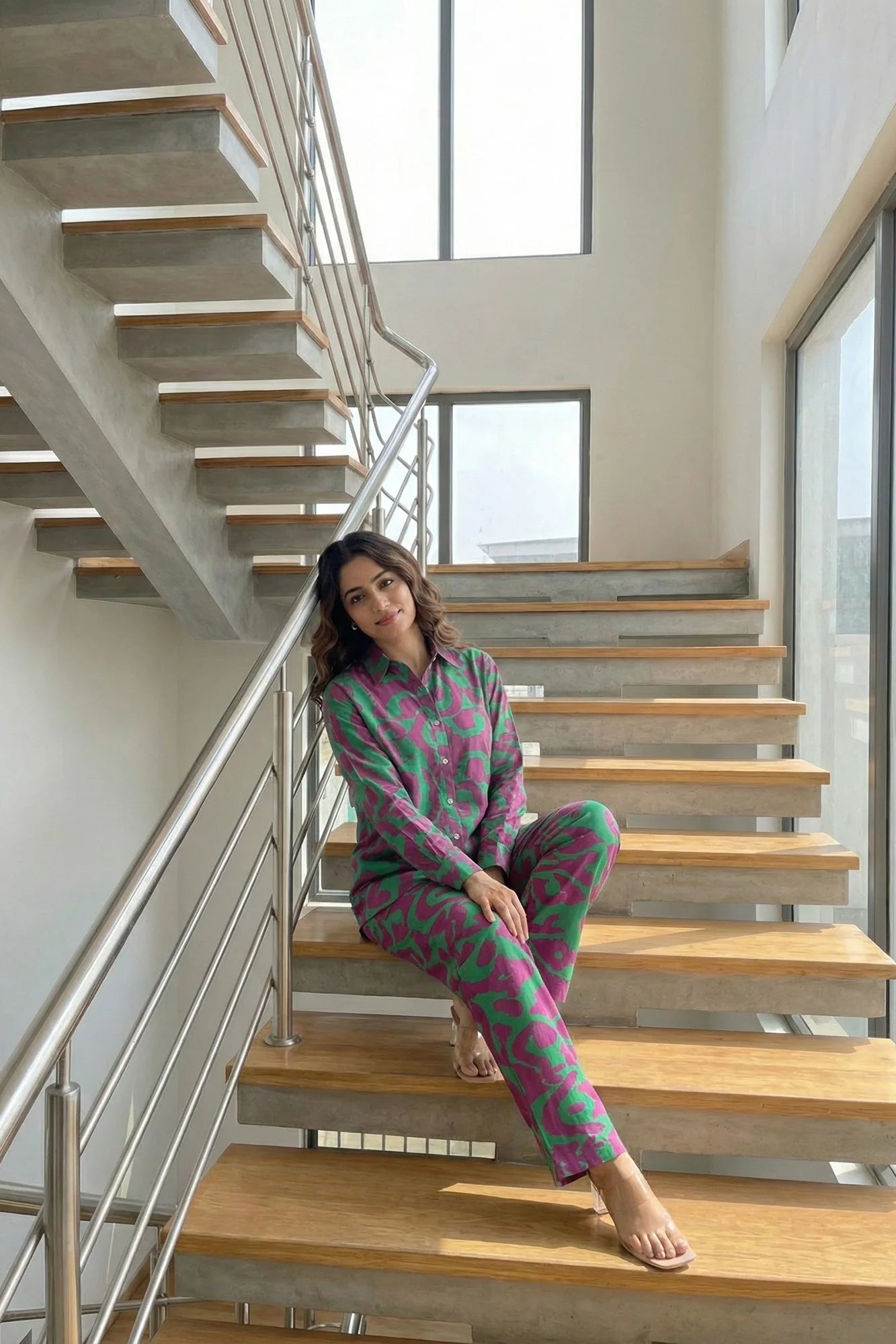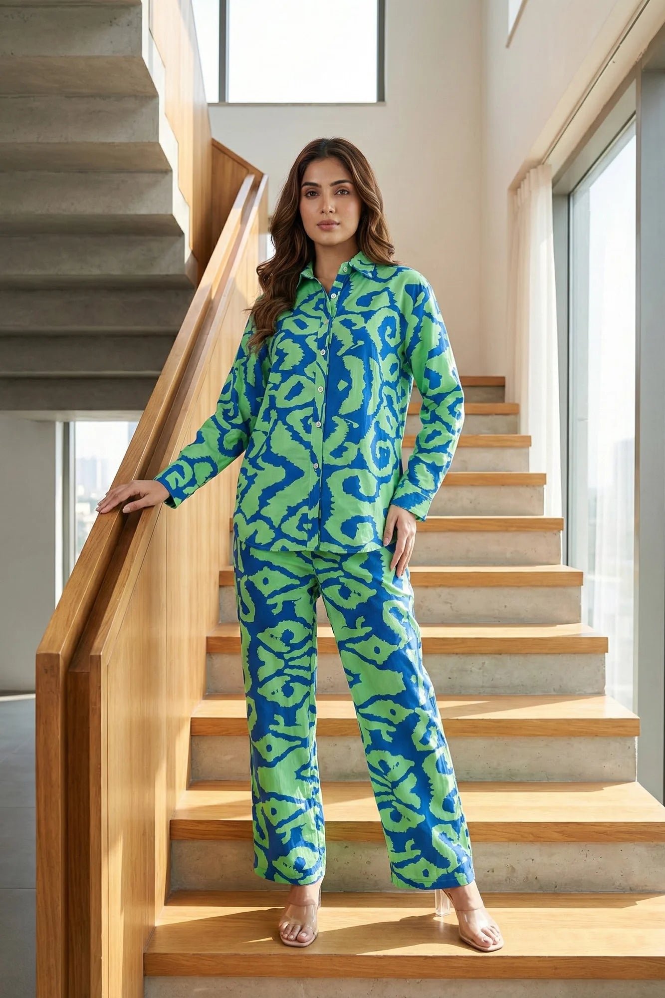 This chic two-piece co-ord set features a bold, abstract pattern throughout. The ensemble includes a classic long-sleeved button-down shirt with... Read more