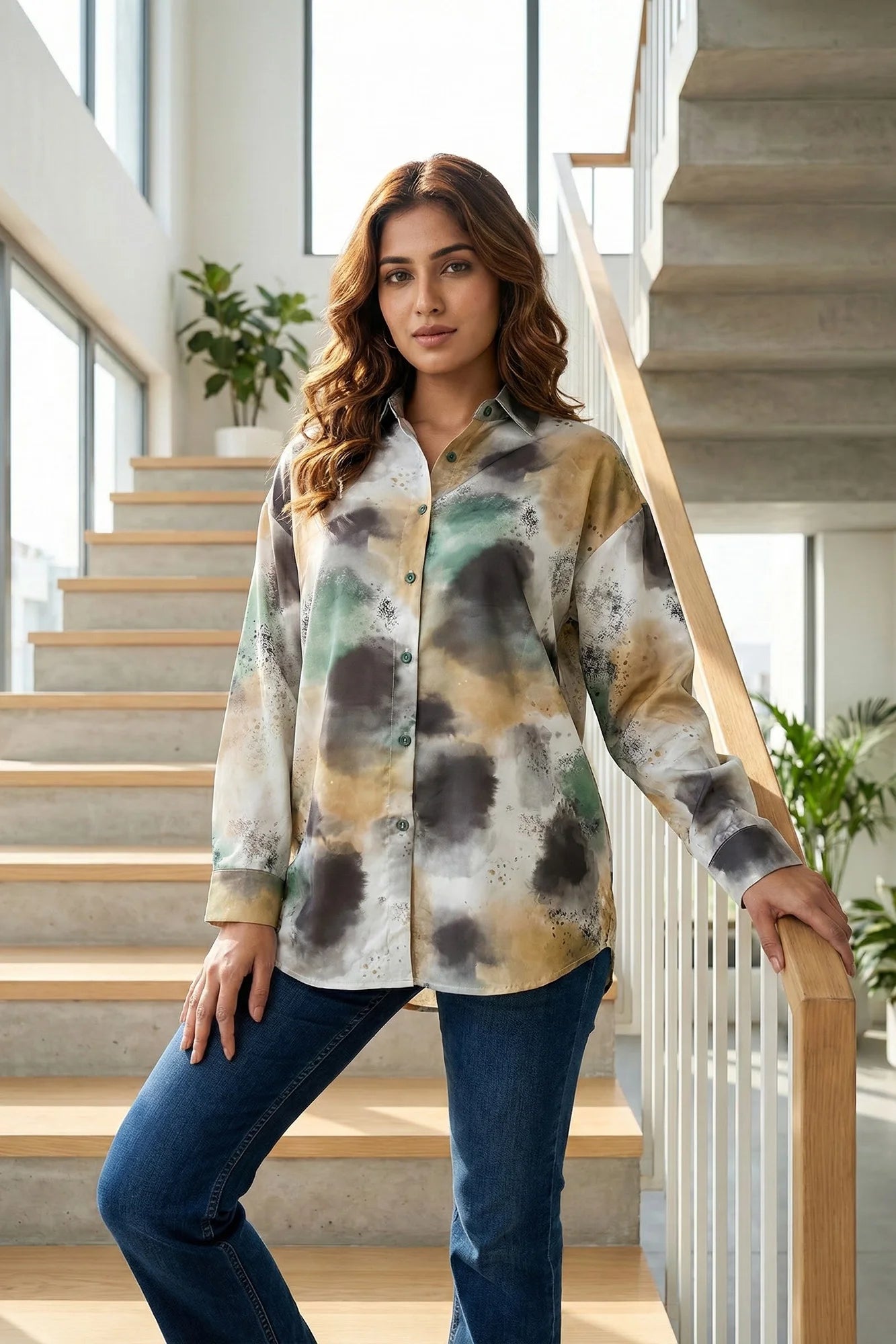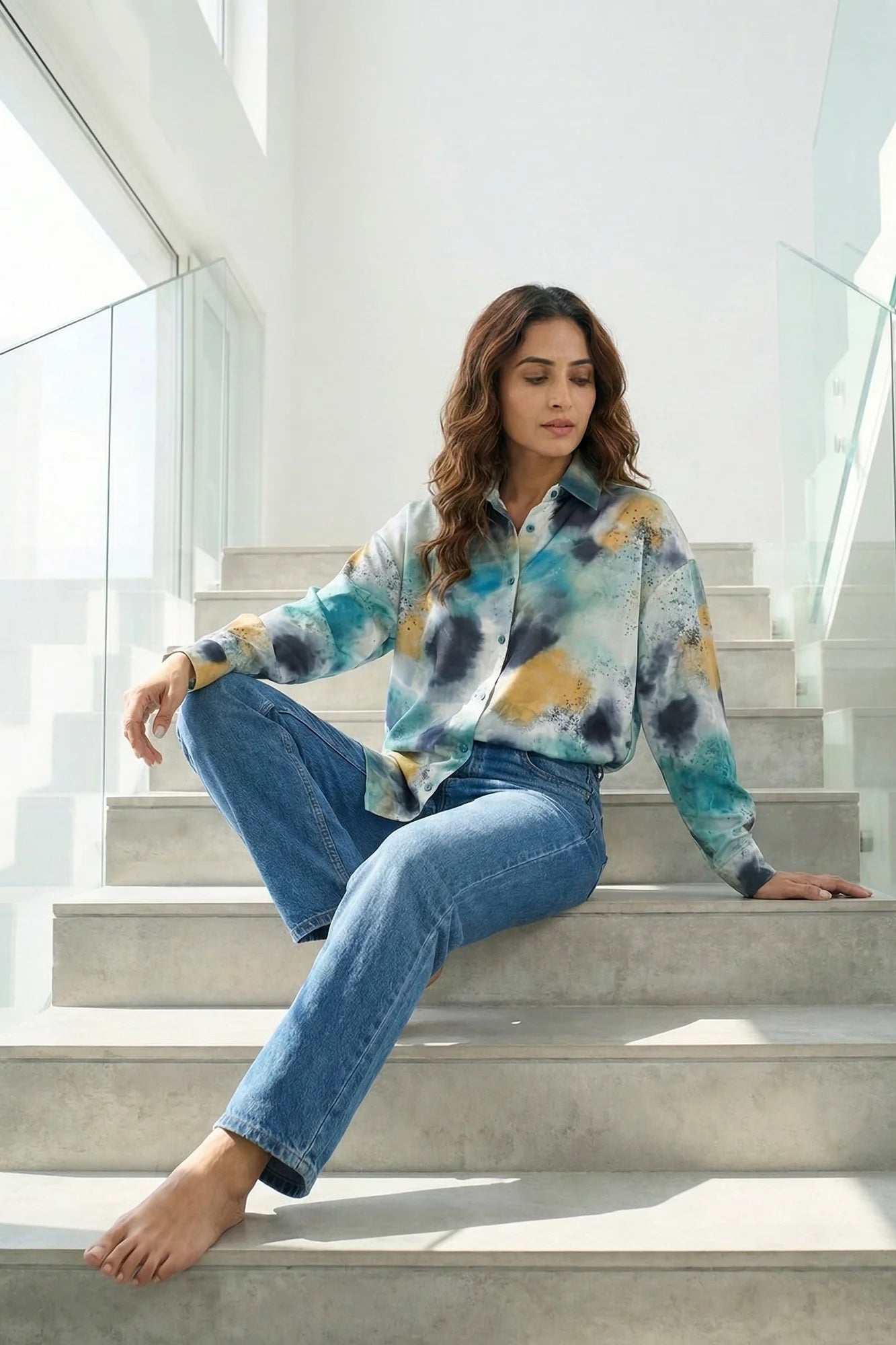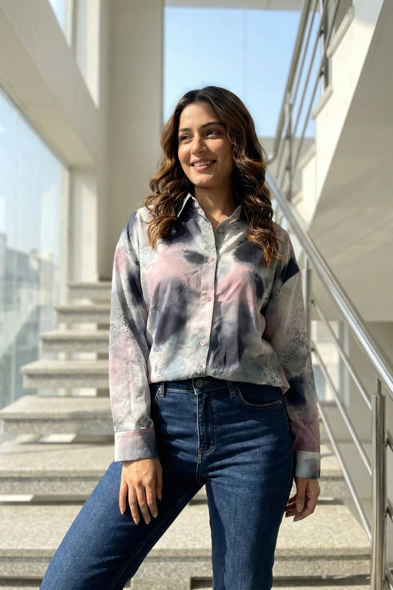 This contemporary shirt features a bold, artistic print resembling abstract watercolor splashes, creating a unique and modern visual texture. Designed... Read more