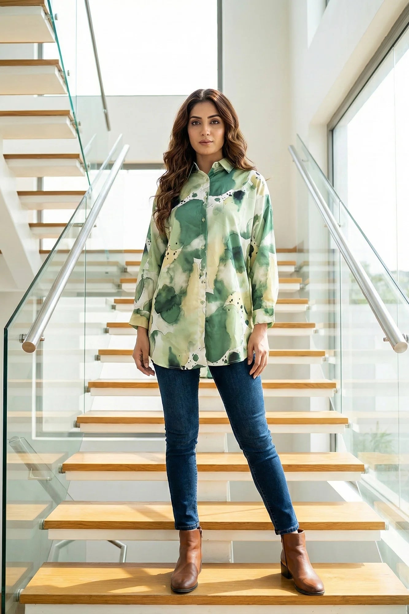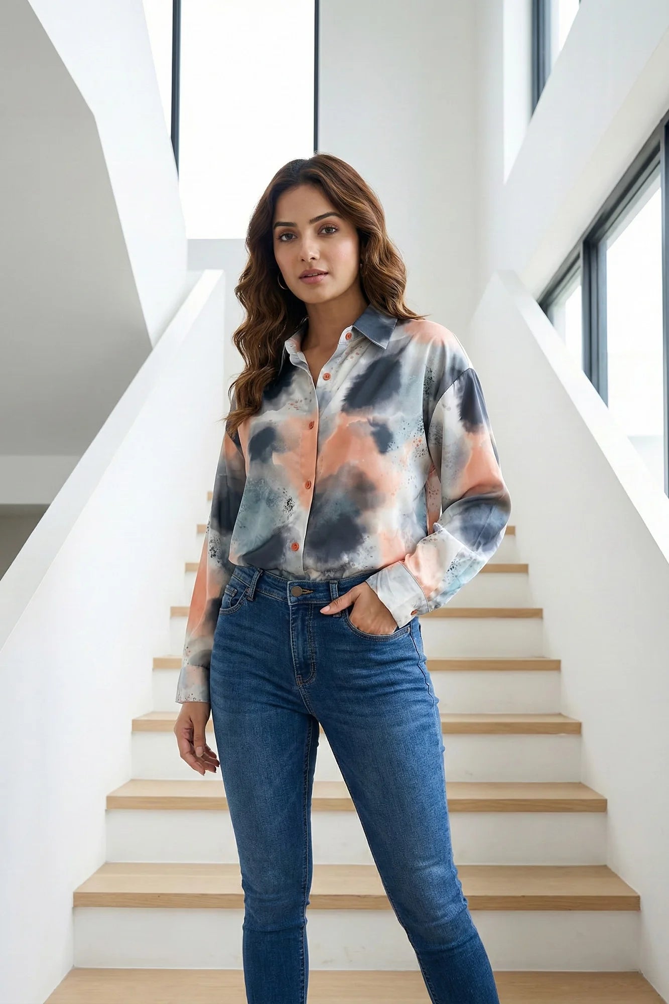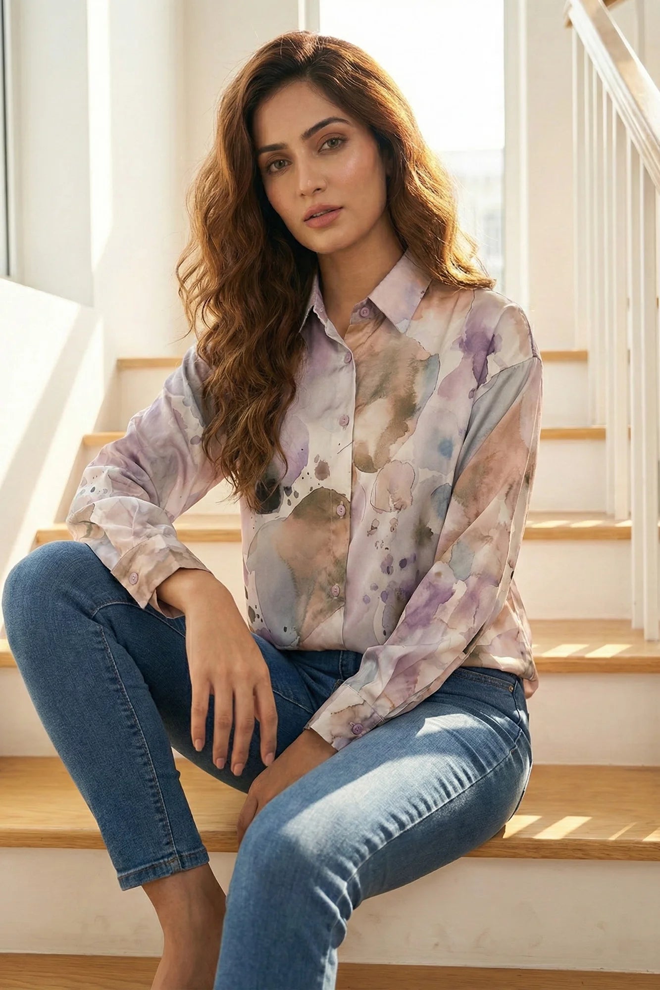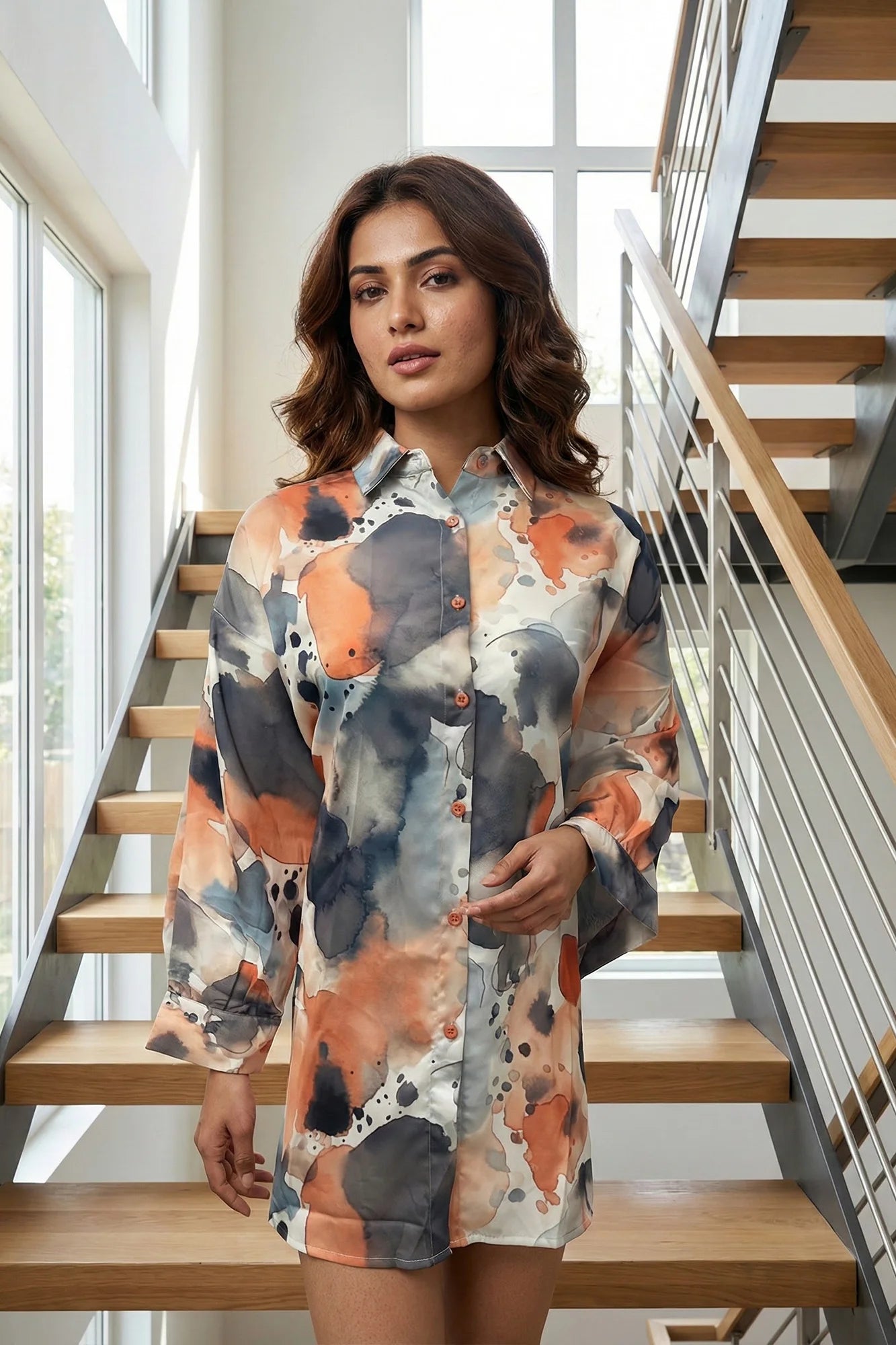 This contemporary shirt features a bold, artistic print resembling abstract watercolor splashes, creating a unique and modern visual texture. Designed... Read more
