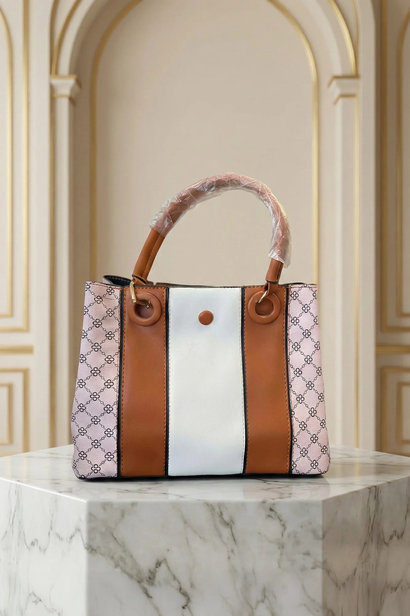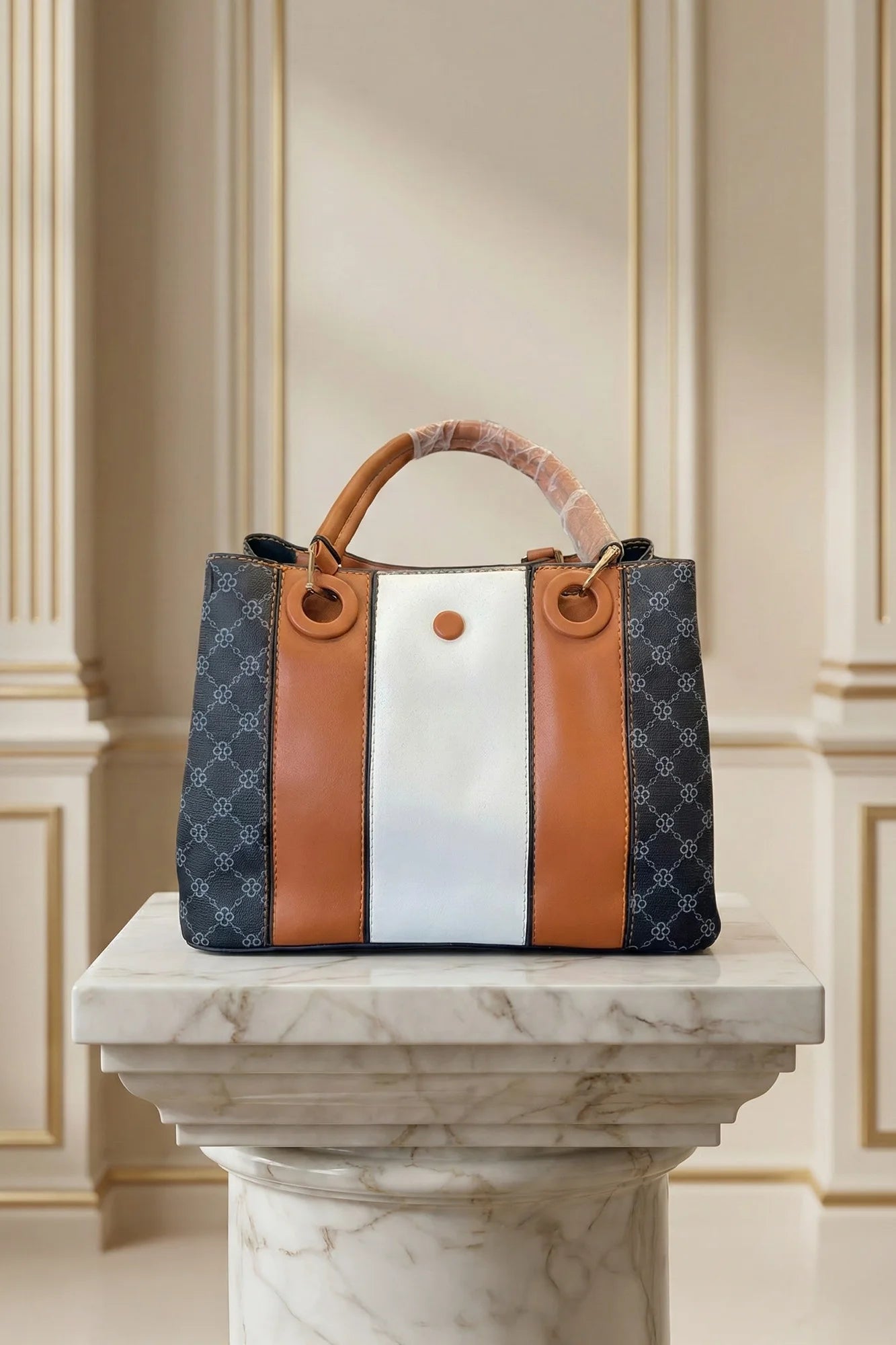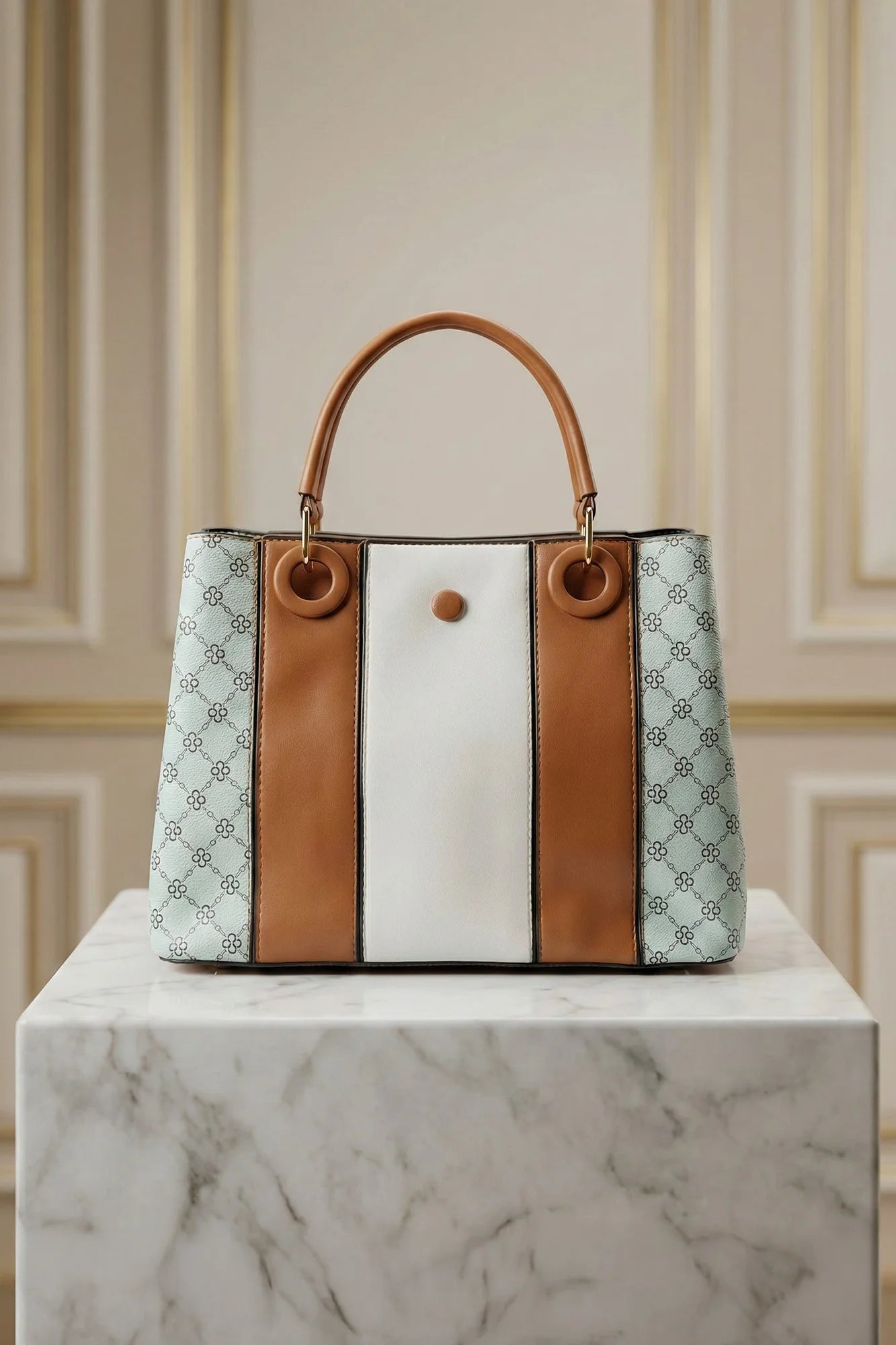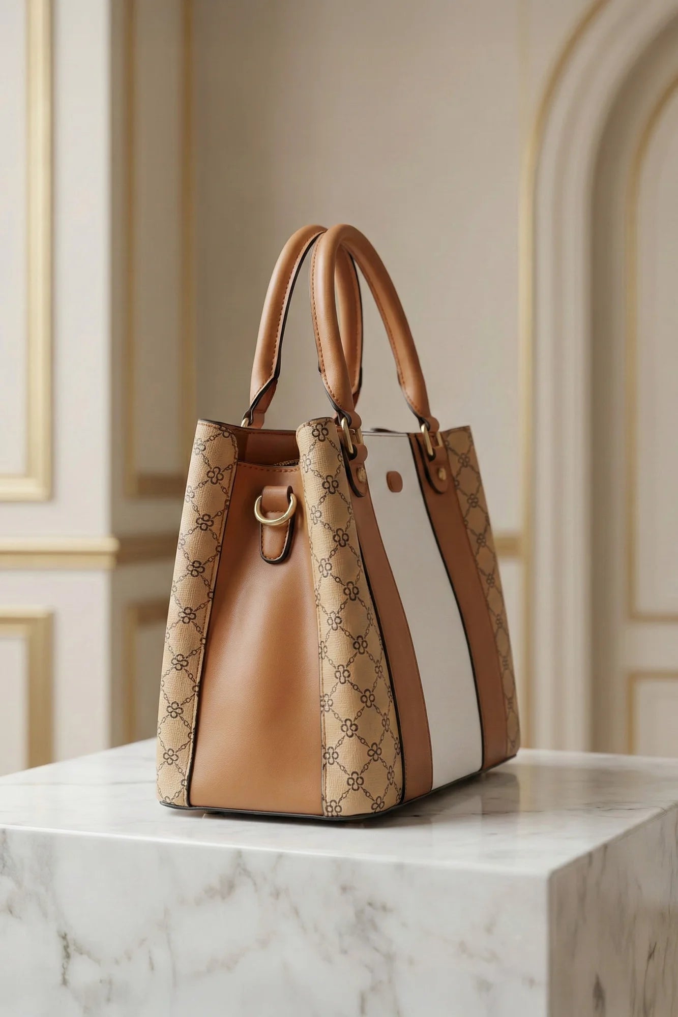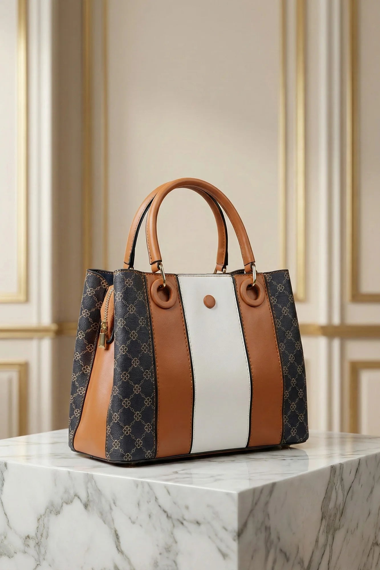 Elevate your everyday style with this sophisticated ladies' handbag, featuring a modern color-block design. This structured tote blends smooth white...