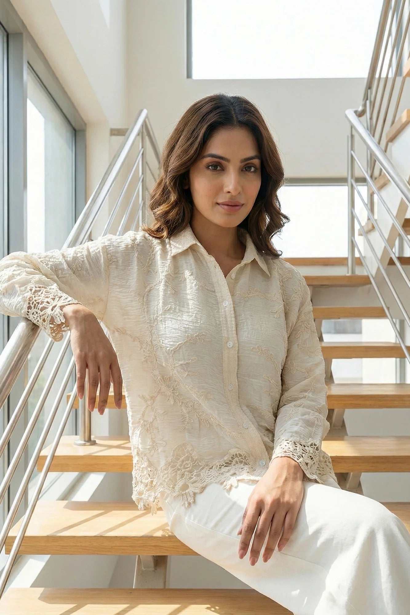 Cream Textured Embroidered Button-Down with Lace Detail