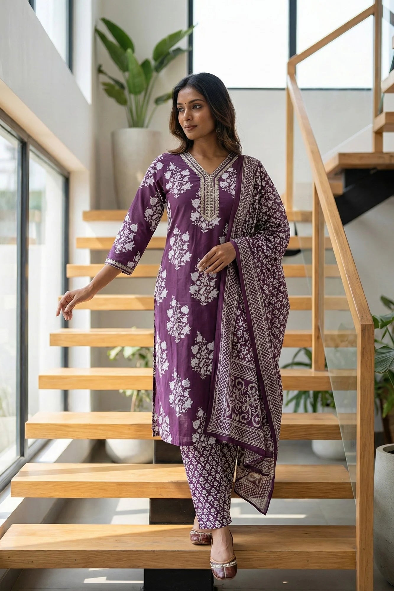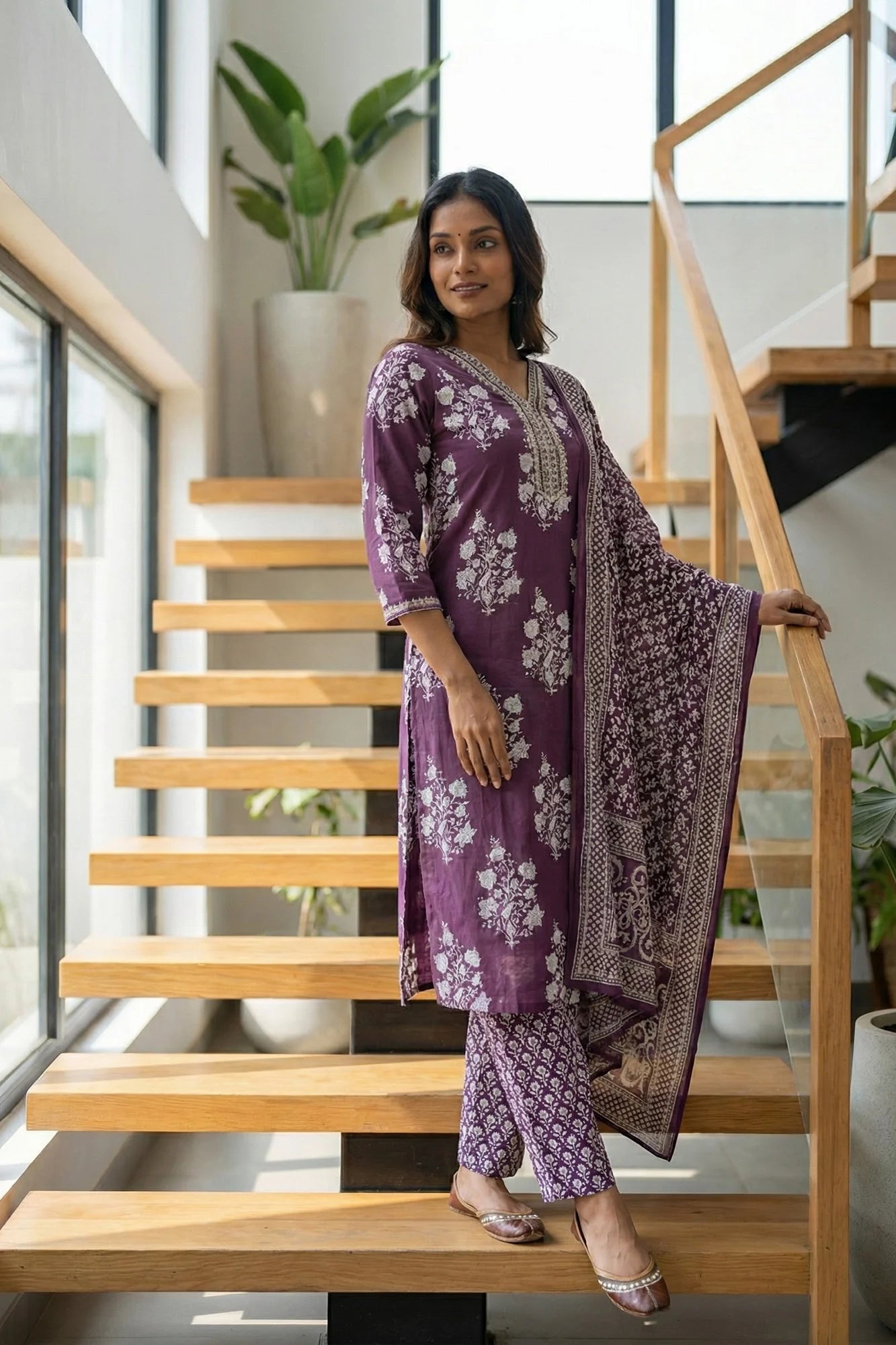 Elevate your everyday ethnic wardrobe with this stunning 3-piece suit set. Crafted from soft, breathable fabric, this set features a... Read more