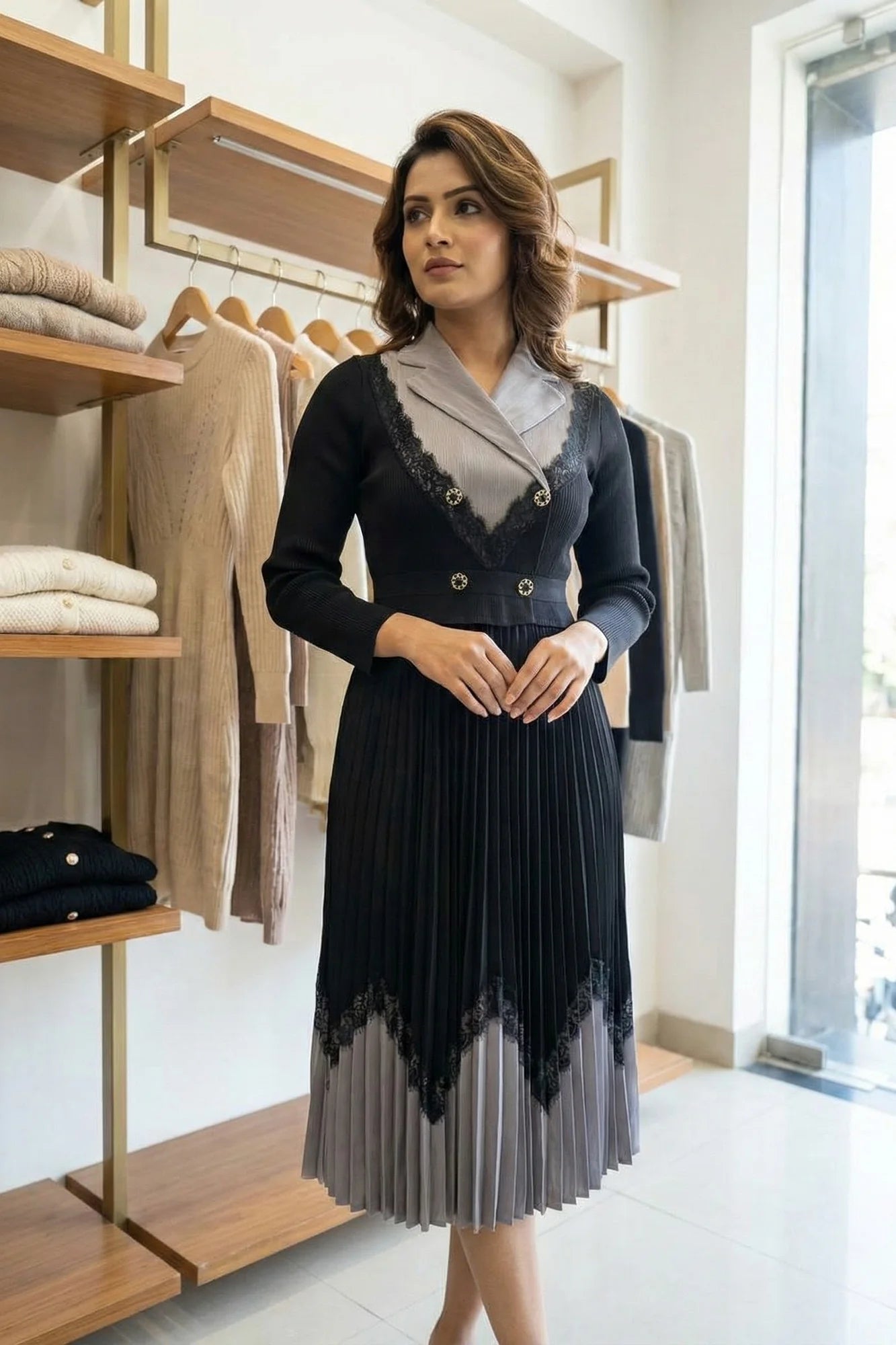 This sophisticated midi dress effortlessly combines tailored structure with feminine grace. The design features a fitted, ribbed-knit bodice with a... Read more