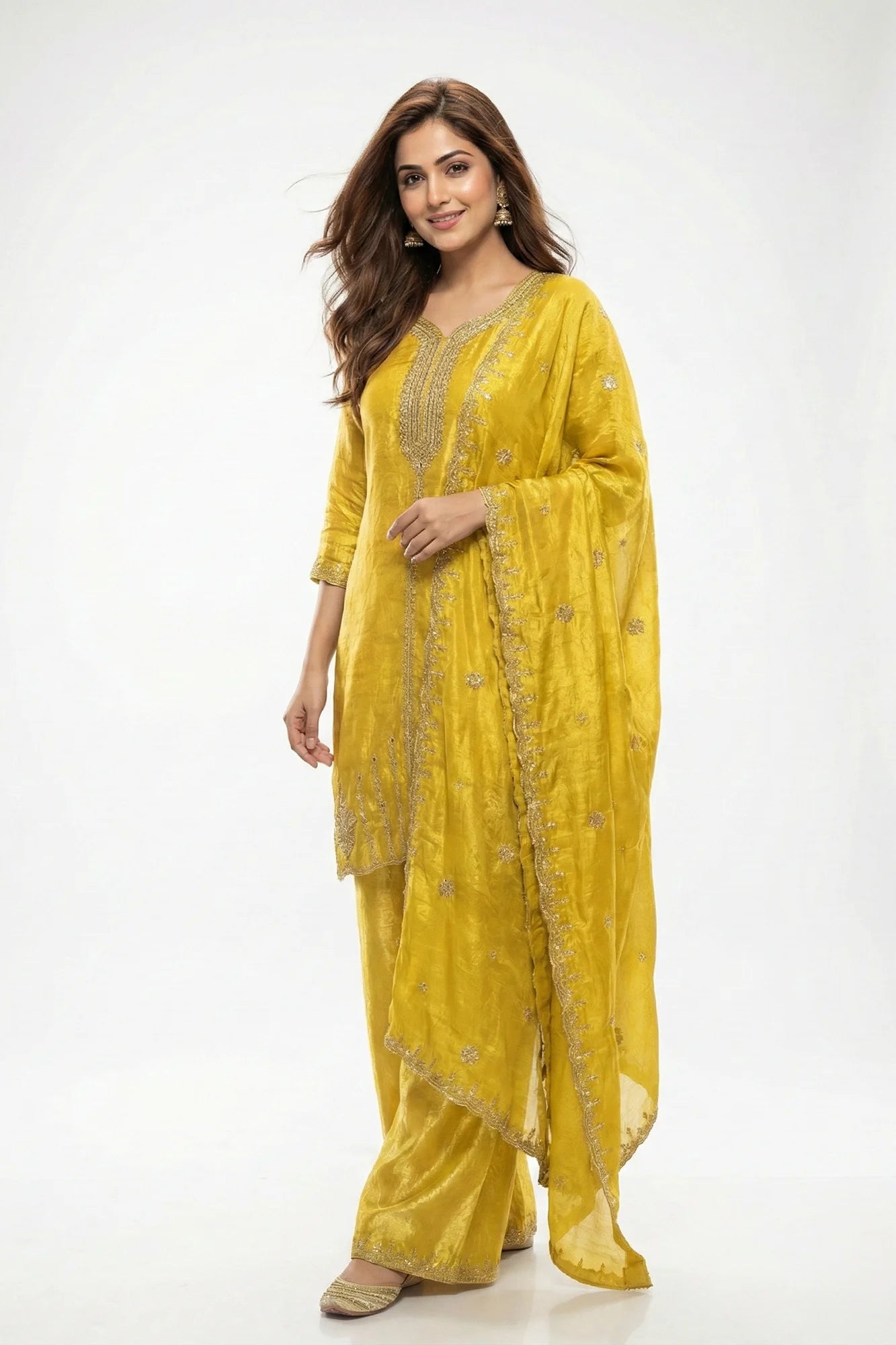 This is a stunning three-piece ethnic ensemble featuring a vibrant yellow hue, making it an ideal choice for festive occasions,...