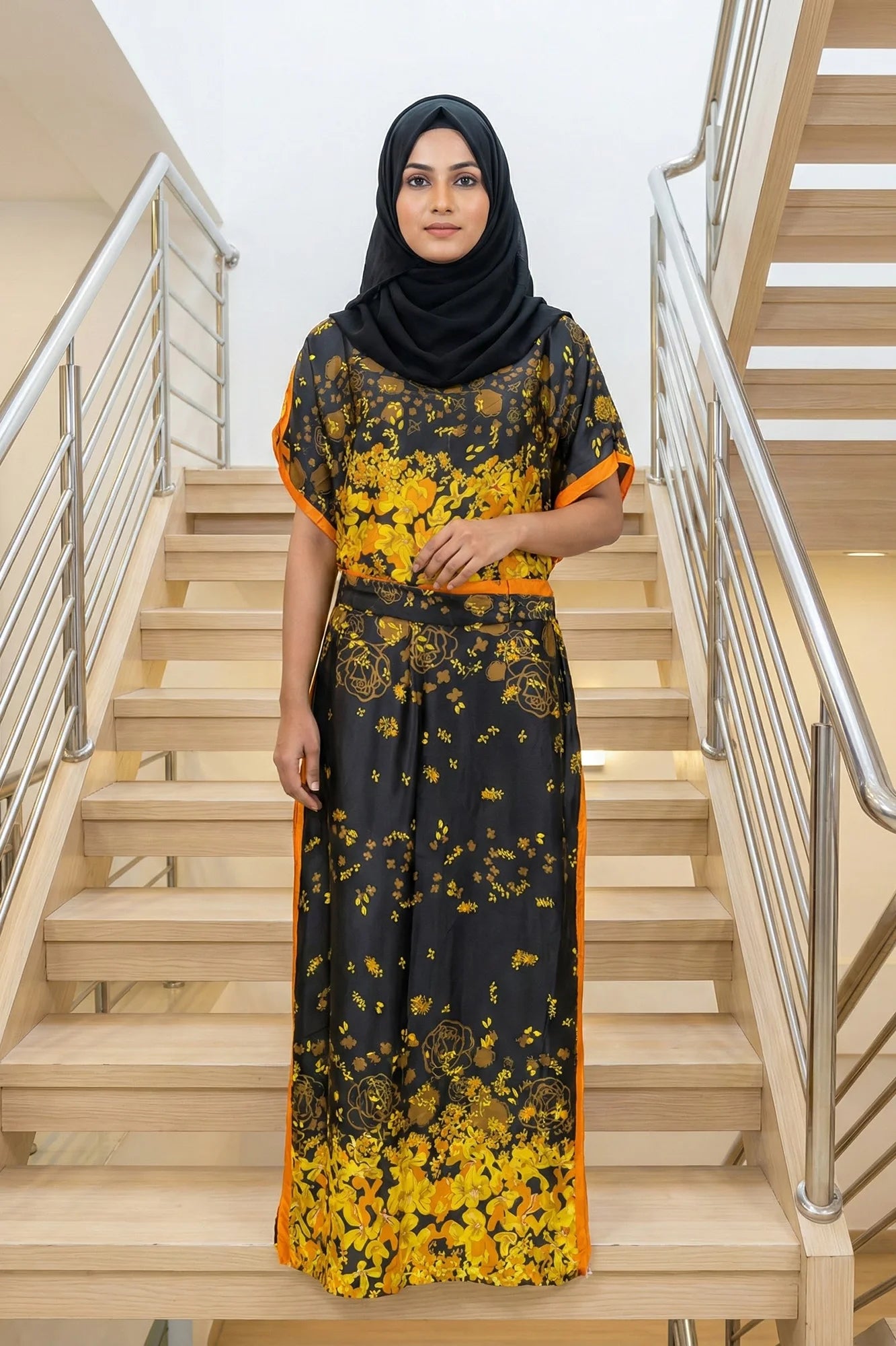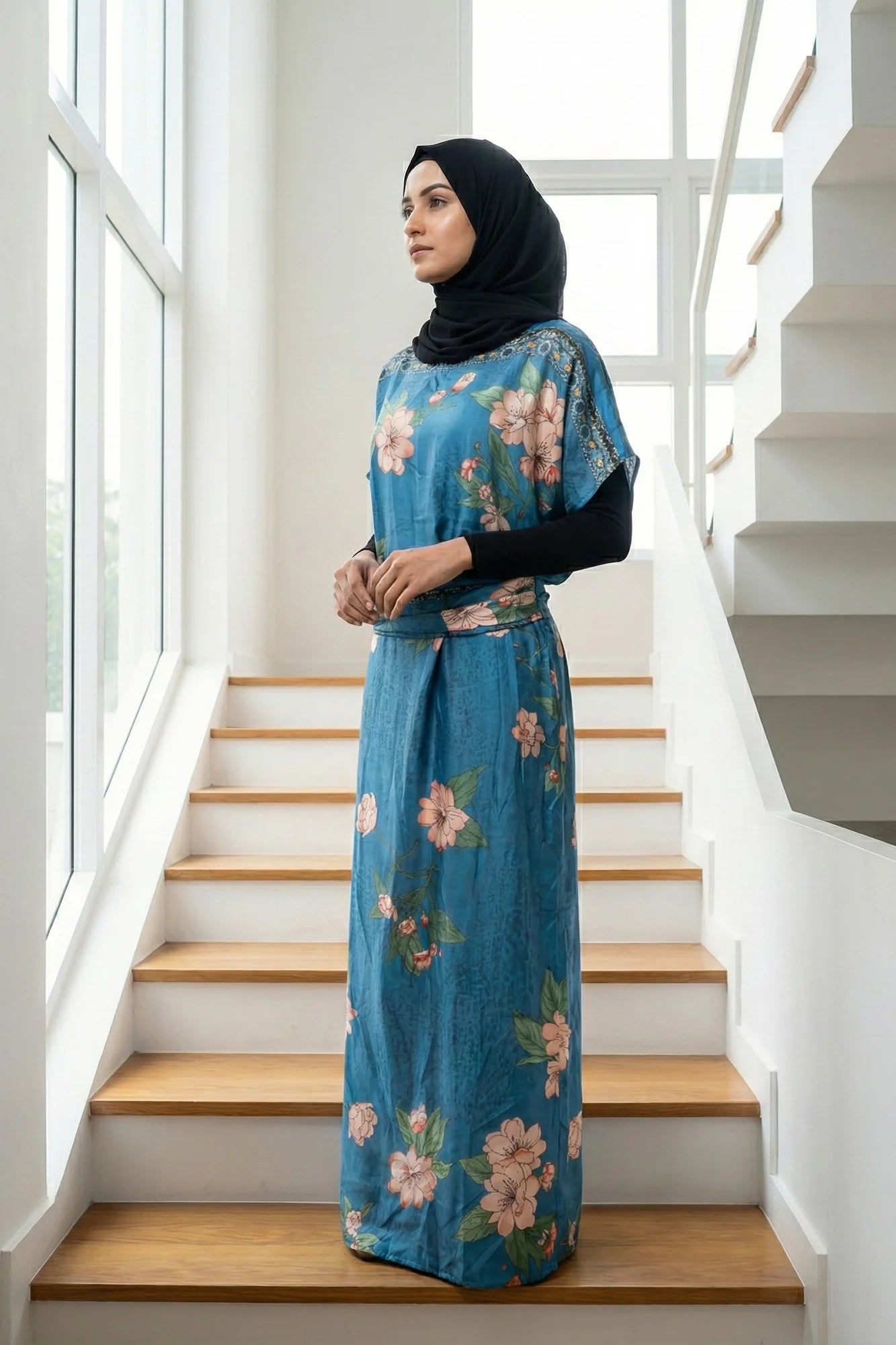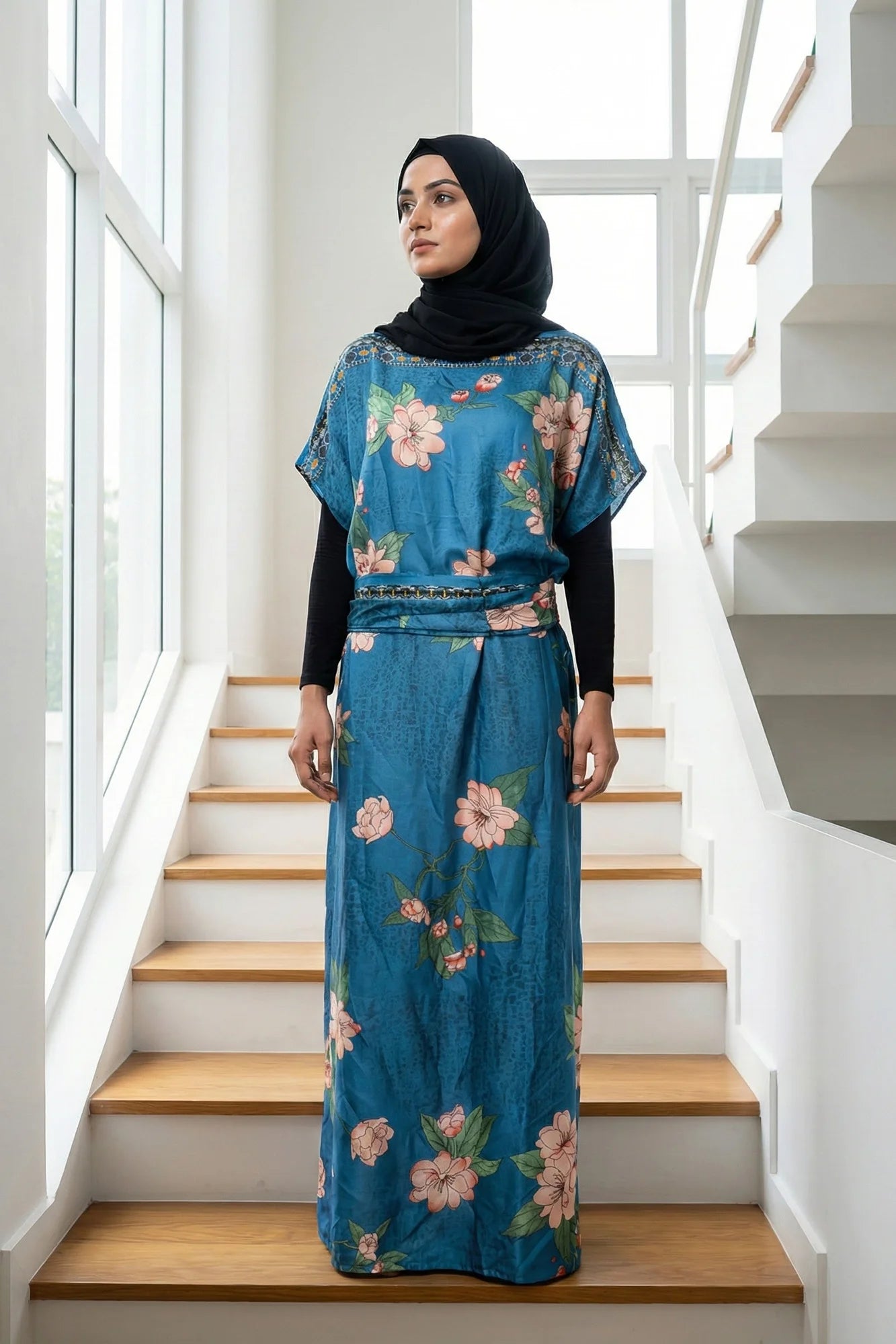 This elegant floor-length kaftan dress features a subtle, textured floral pattern throughout the main fabric, giving it a sophisticated sheen.... Read more