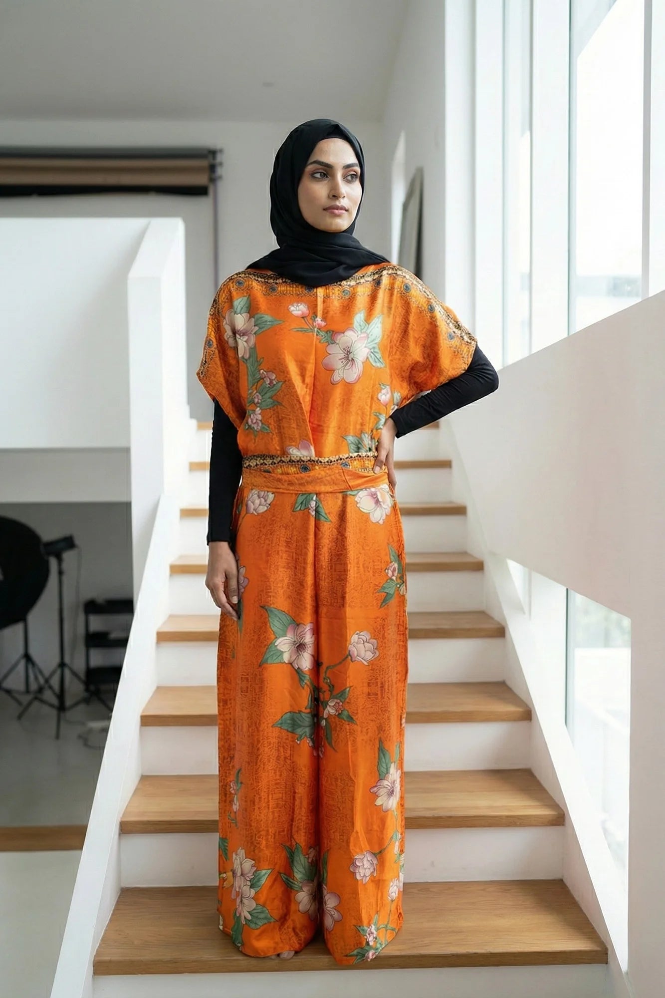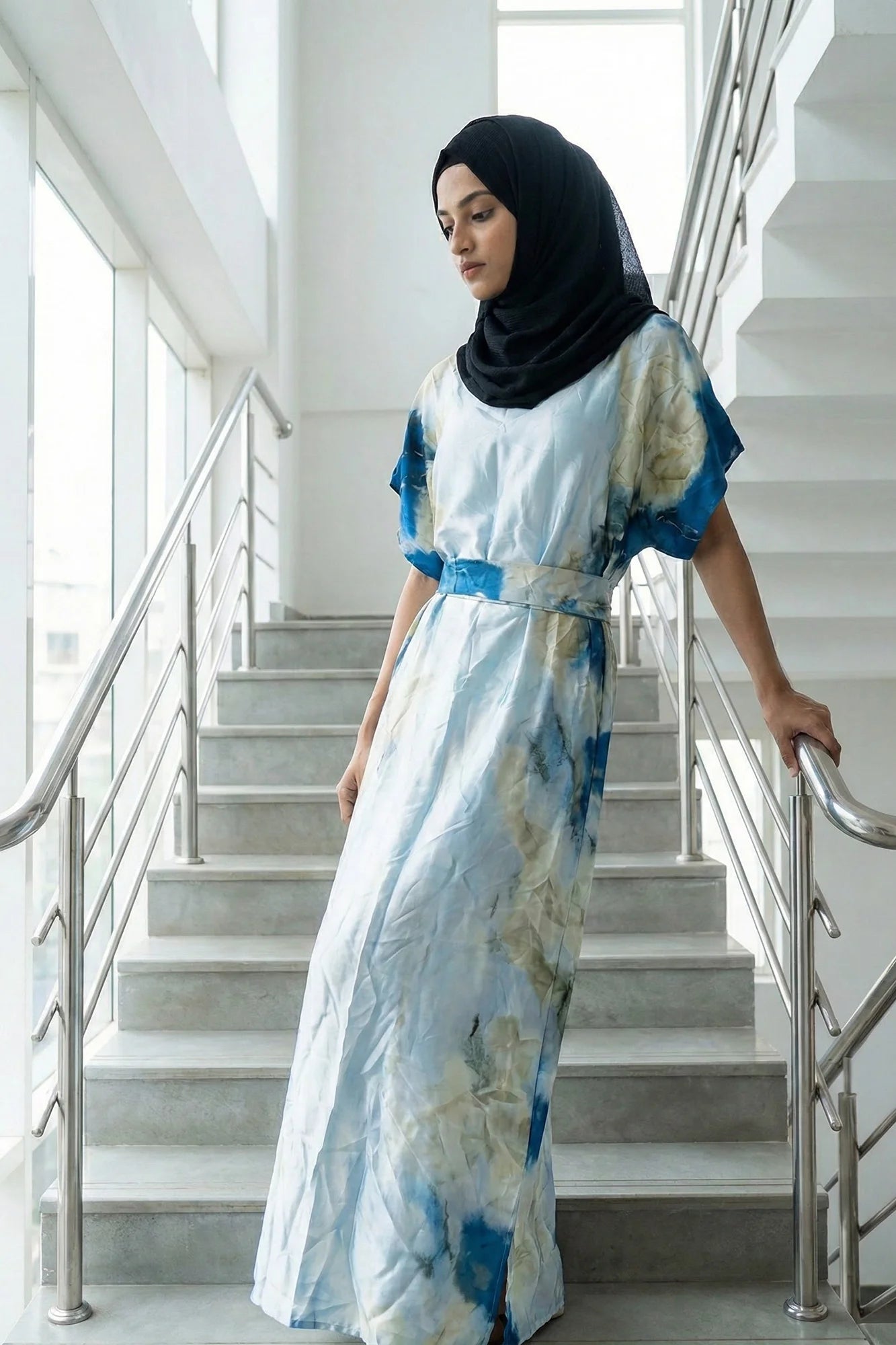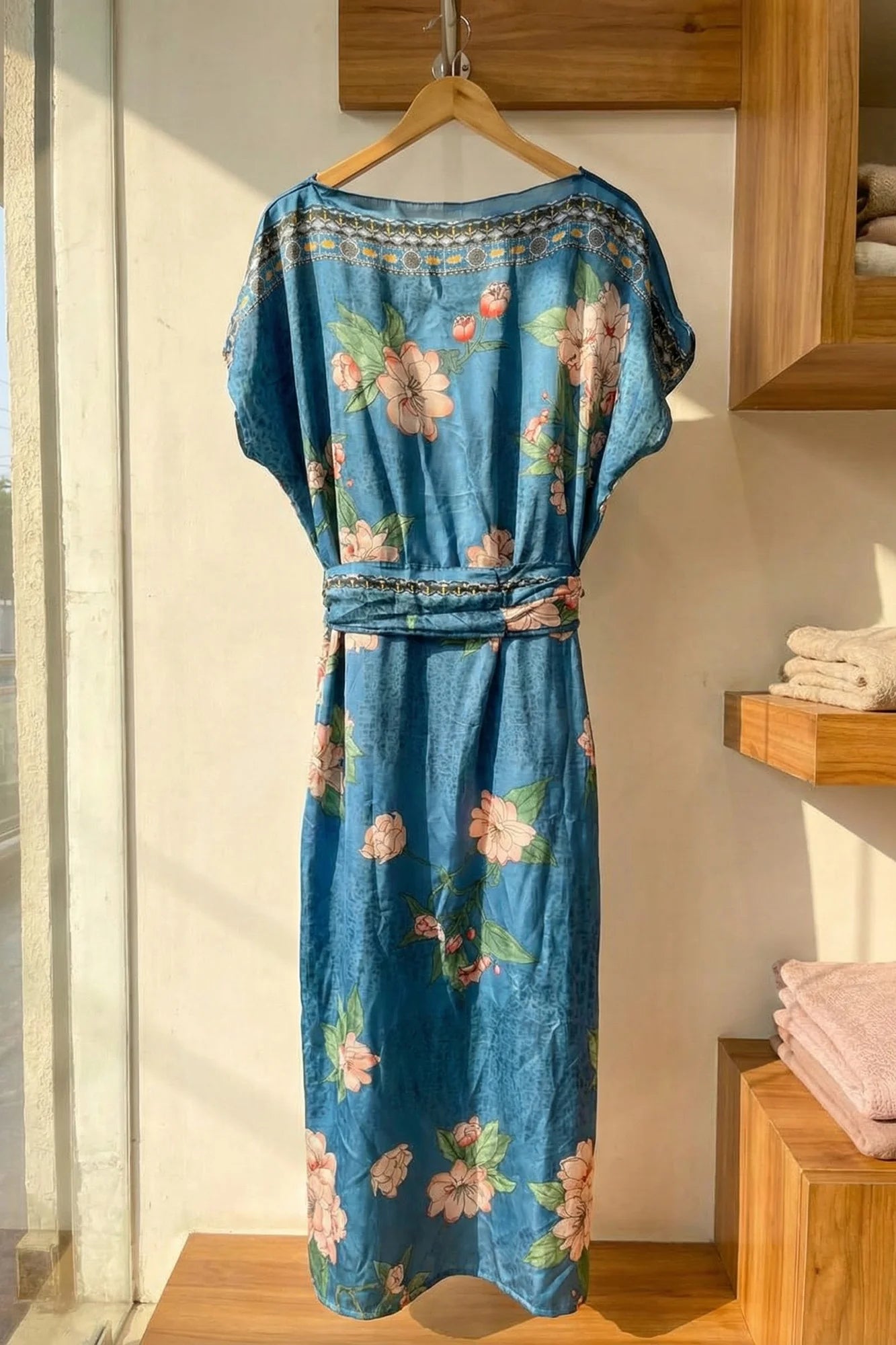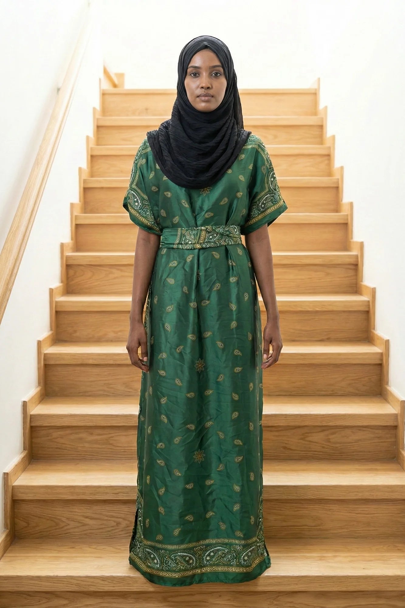 This elegant floor-length kaftan dress features a subtle, textured floral pattern throughout the main fabric, giving it a sophisticated sheen.... Read more