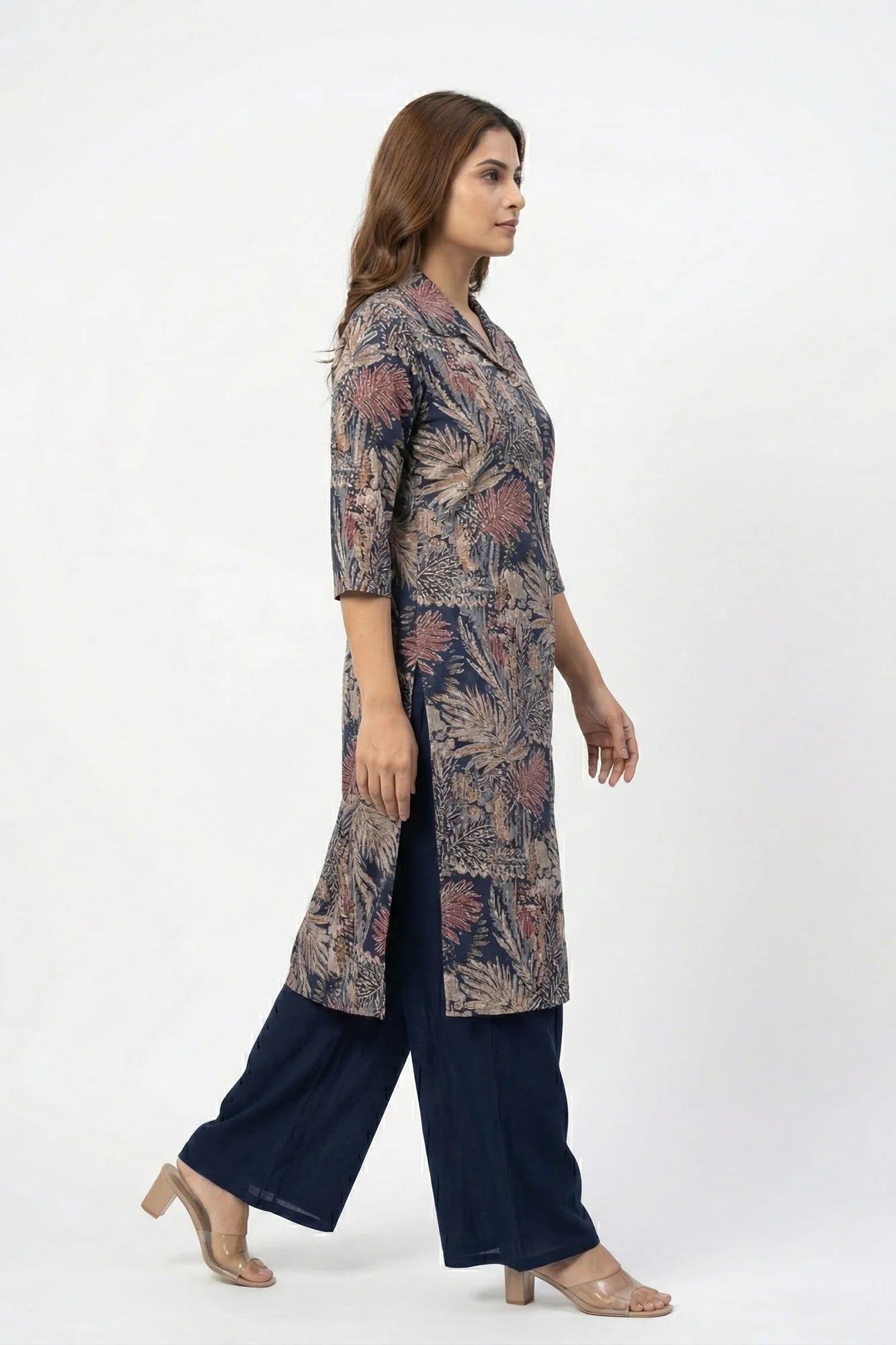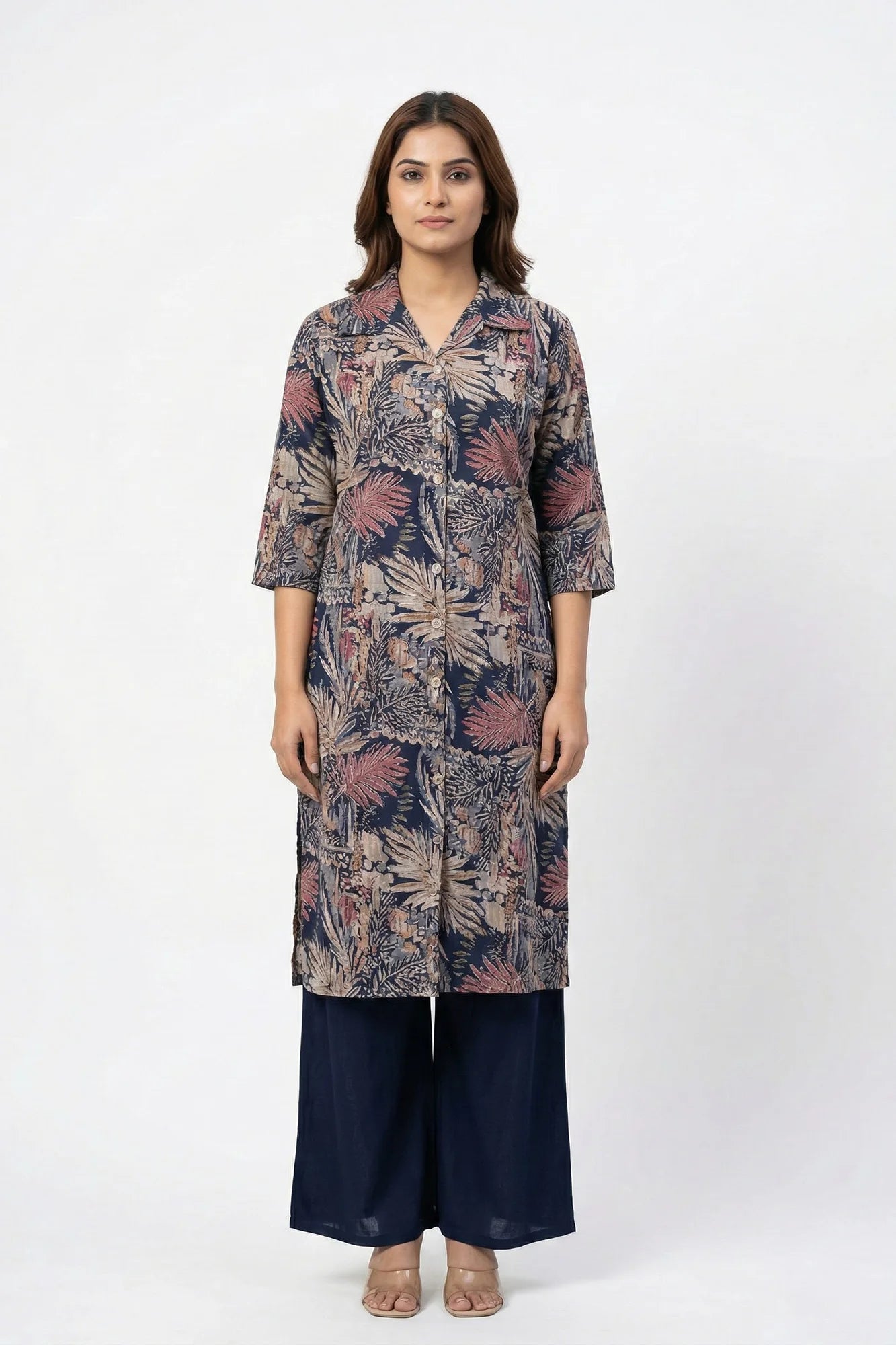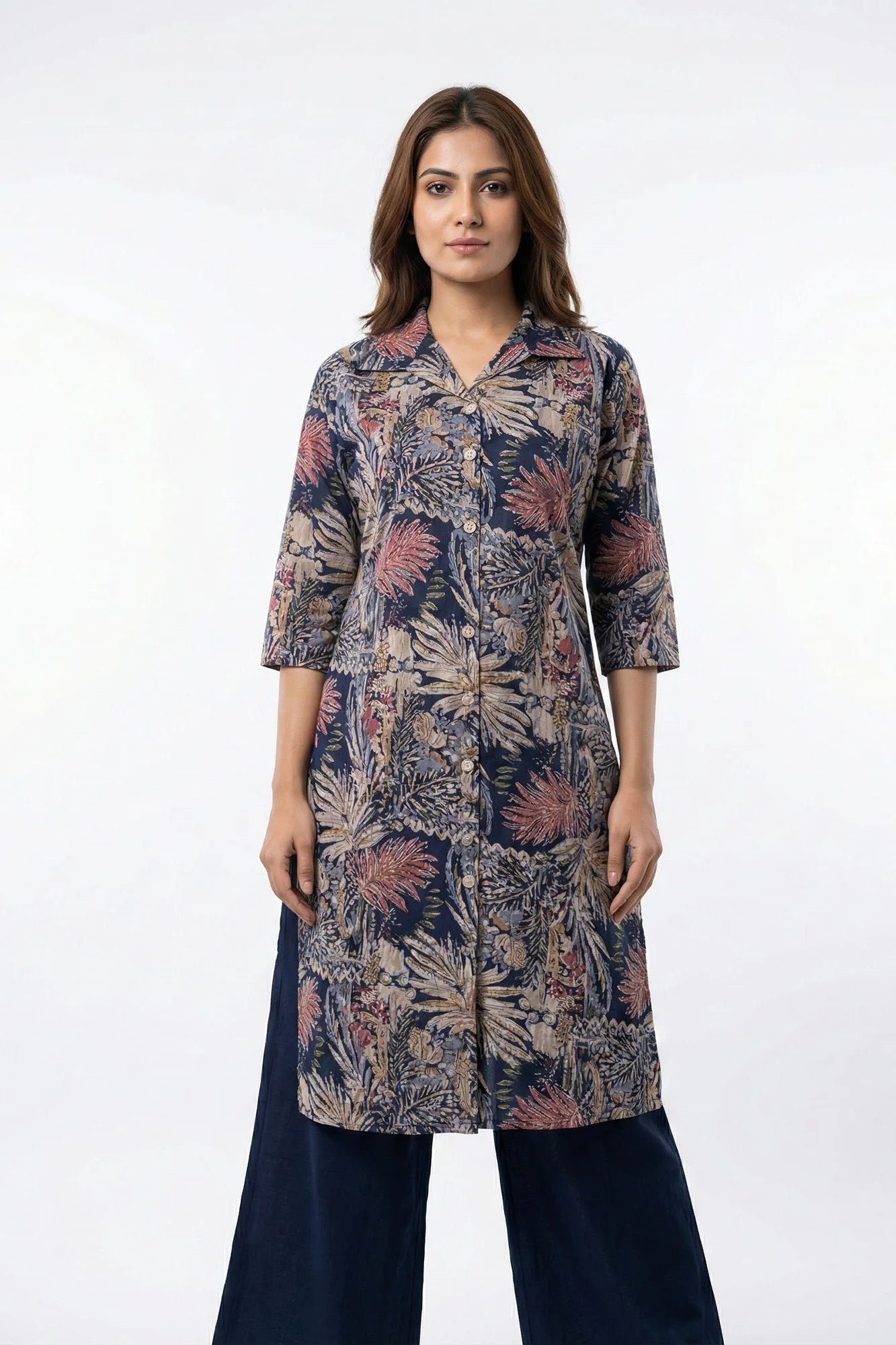 Elevate your everyday style with this chic navy blue button-down kurti. Featuring an artistic botanical print with fern motifs in...
