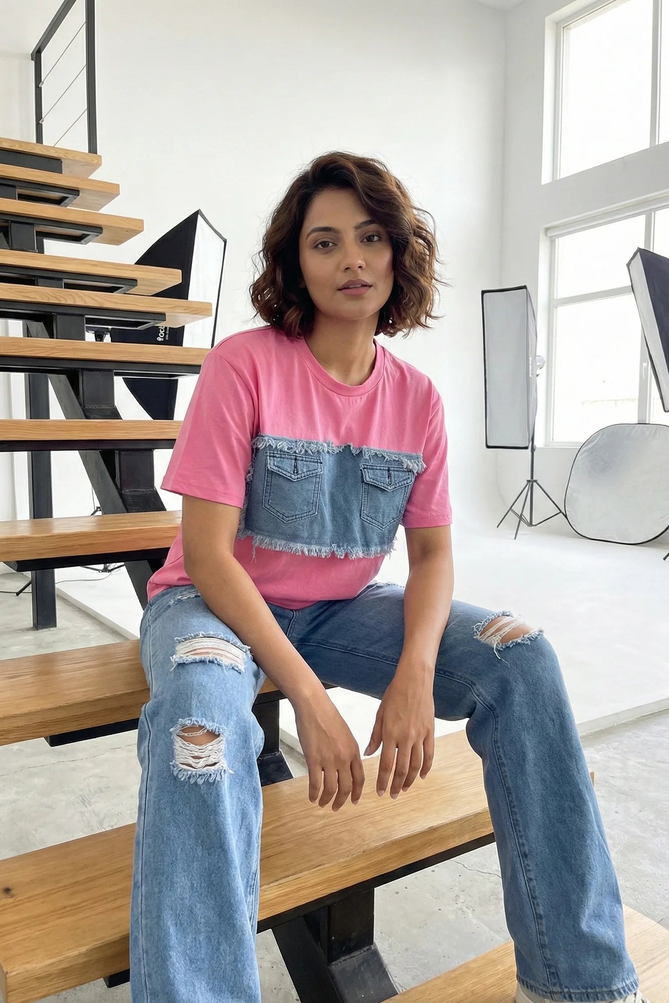 Effortlessly Cool. Unapologetically Trendy. Master the art of street style with this curated two-piece set. We’ve paired the softness of a classic pink tee with the rugged appeal of distressed denim to create a look that balances feminine charm with urban edge. Whether you are heading to campus, grabbing coffee, or creating content, this outfit ensures you stand out with zero effort.
