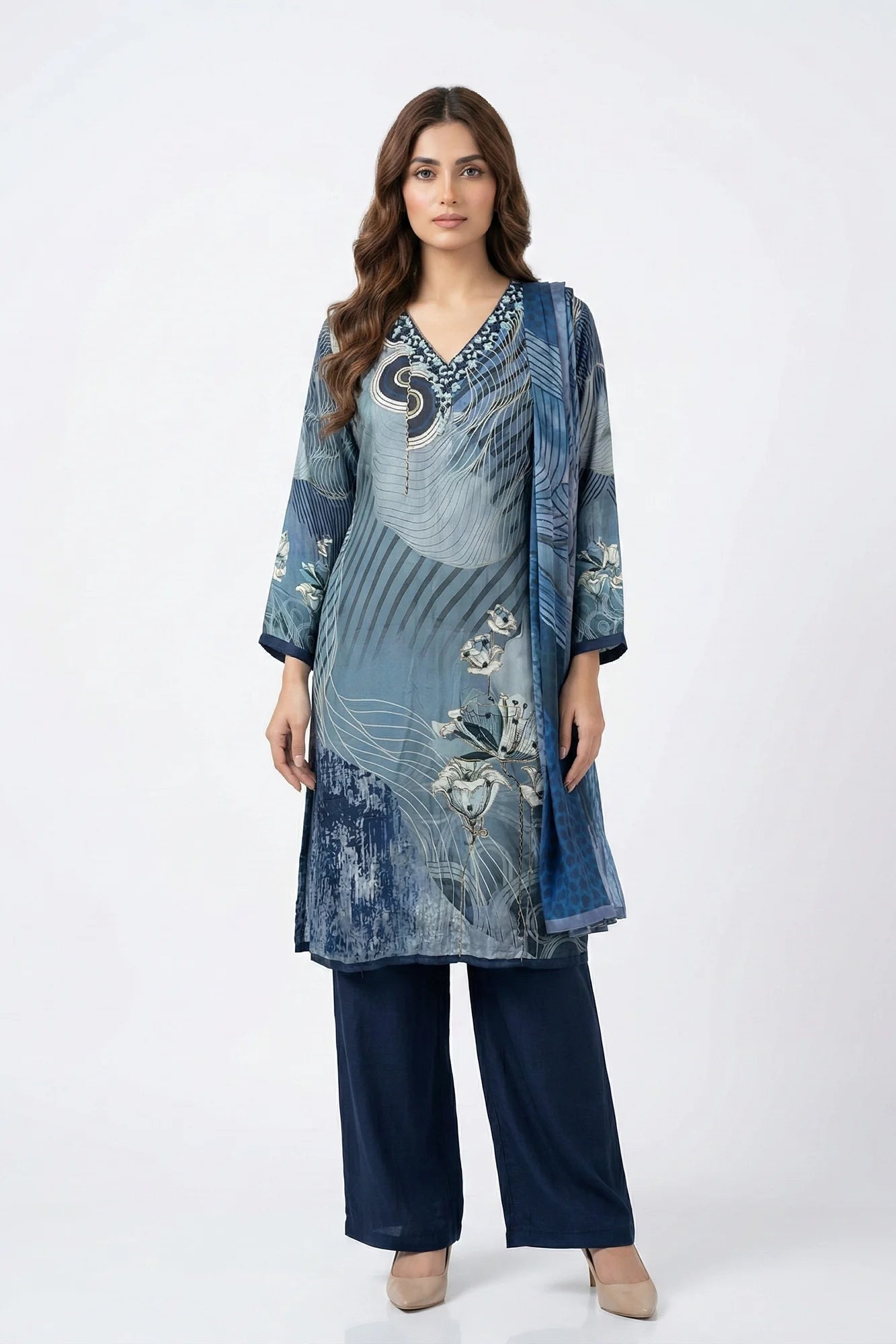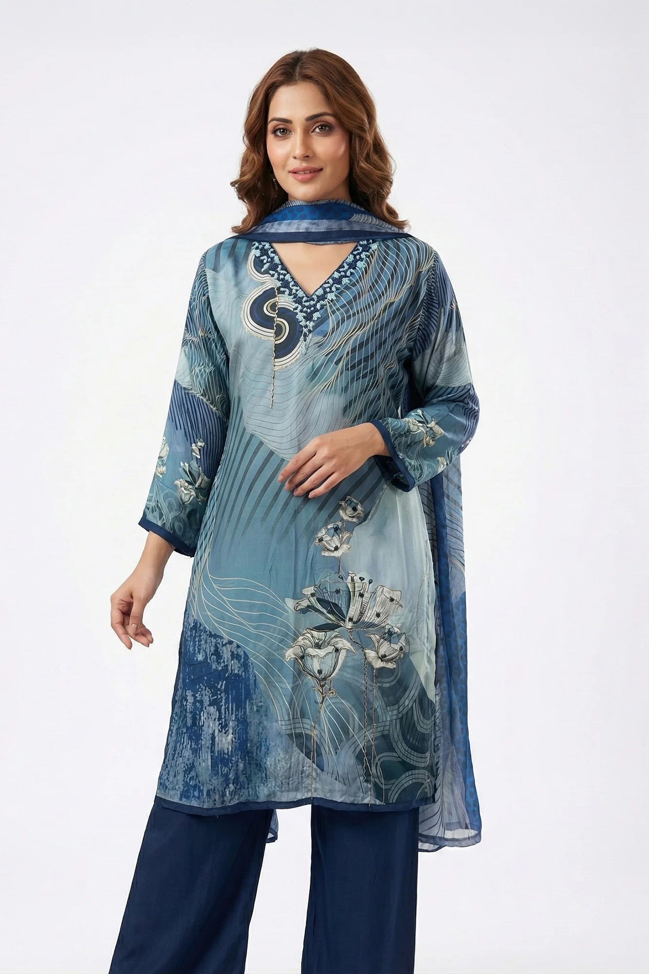 Teal Blue Abstract Floral Print Suit Set with Hand-Beaded Neckline