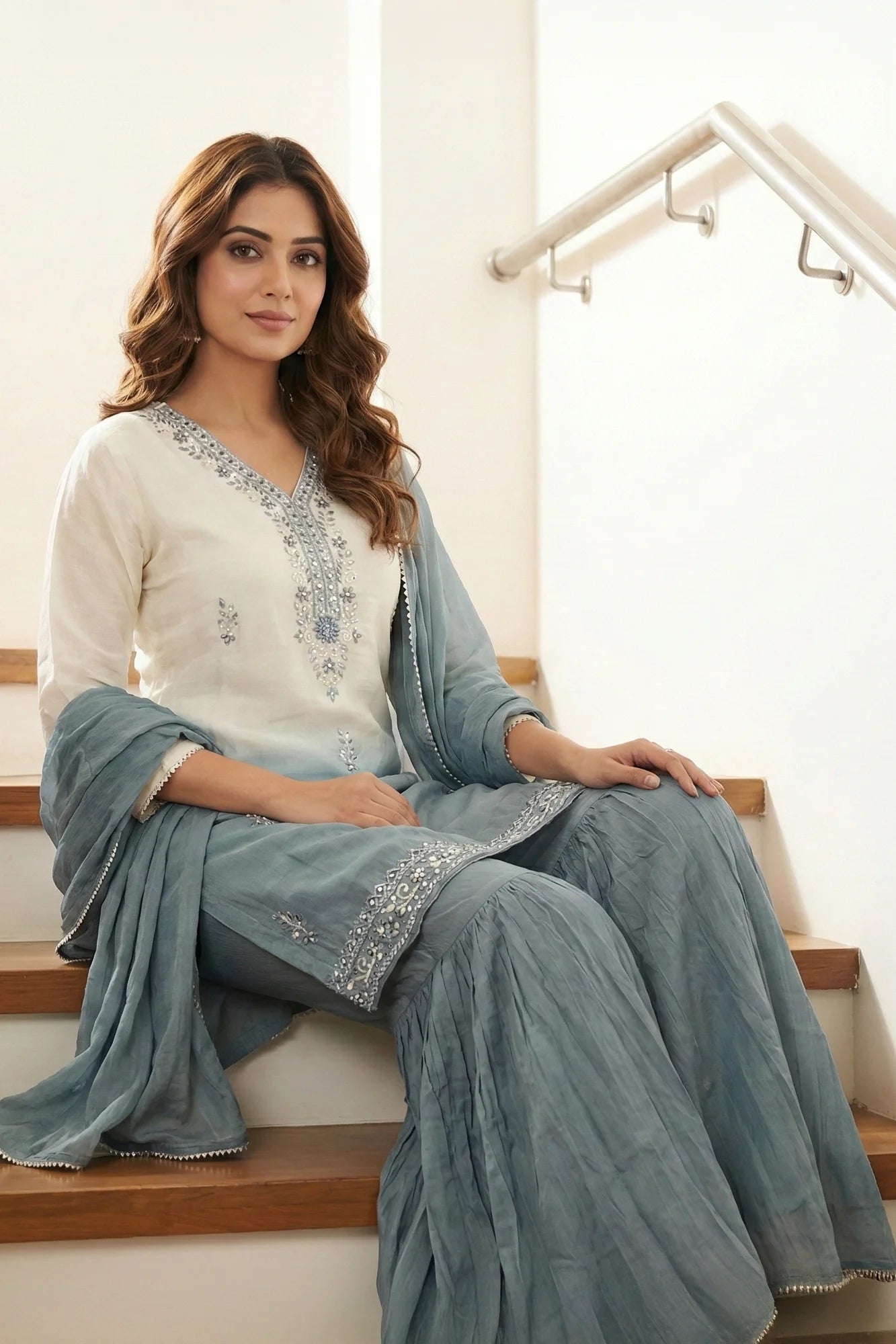 Elevate your festive wardrobe with this stunning White and Steel Blue Ombre Sharara Set. This designer ensemble features a chic...